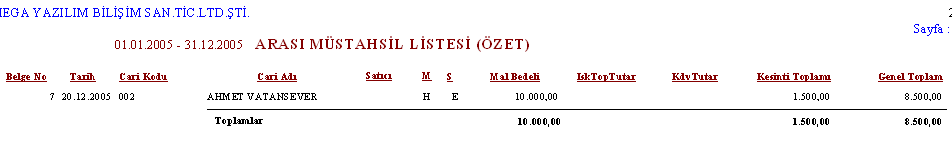 Verilen Tarih, Makbuz No, Cari Kodu, Satıcı Kodu aralığına göre aşağıdaki başlık