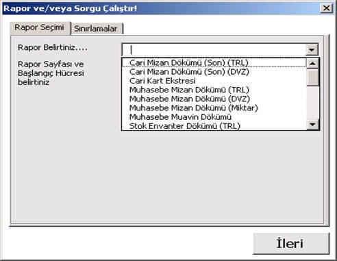 Örnek olarak Rapor seçiminden Cari Kart Ekstre dökümünü seçiyoruz, sınırlamalar belirlendikten sonra ileri diyoruz.